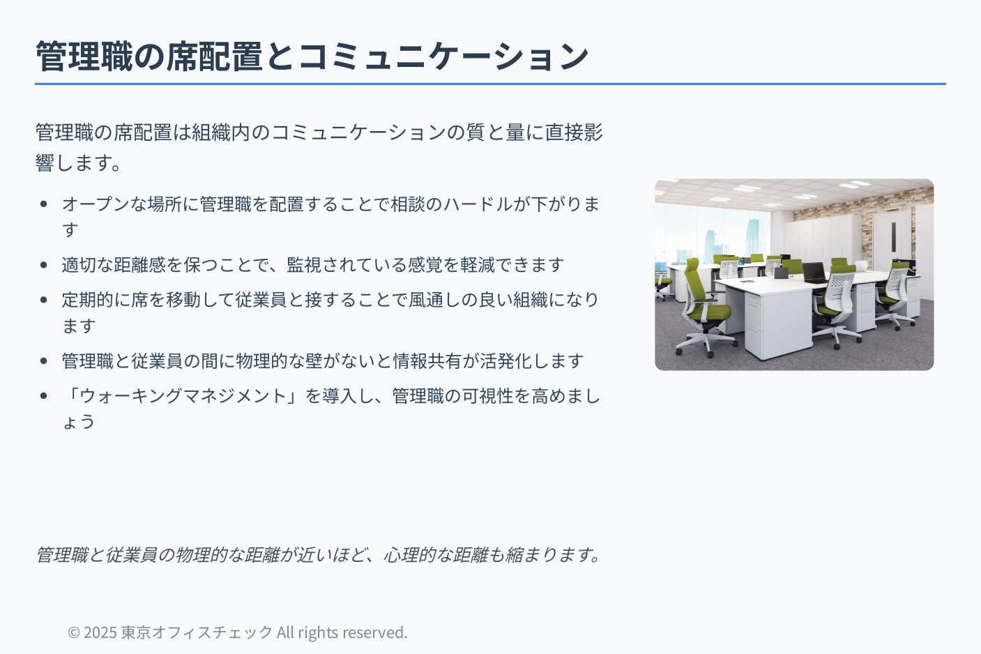 管理職の席配置は、従業員とのコミュニケーションに大きな影響を与えます。管理職がオープンなスペースに配置されると、従業員は気軽に相談や意見交換がしやすくなります。これにより、組織内の情報共有が活発になり、仕事の効率も向上します。一方で、管理職が閉鎖的なスペースに配置されると、従業員との間に壁ができ、コミュニケーションが減少する可能性があります。これを避けるためには、共通エリアやオープンスペースに移動する頻度を増やすなどの工夫が必要です。例えば、一部の企業では、管理職が定期的に従業員と同じエリアで働く「ウォーキングマネジメント」を導入して成功しています。これにより、管理職と従業員の距離が縮まり、コミュニケーションが円滑になります。