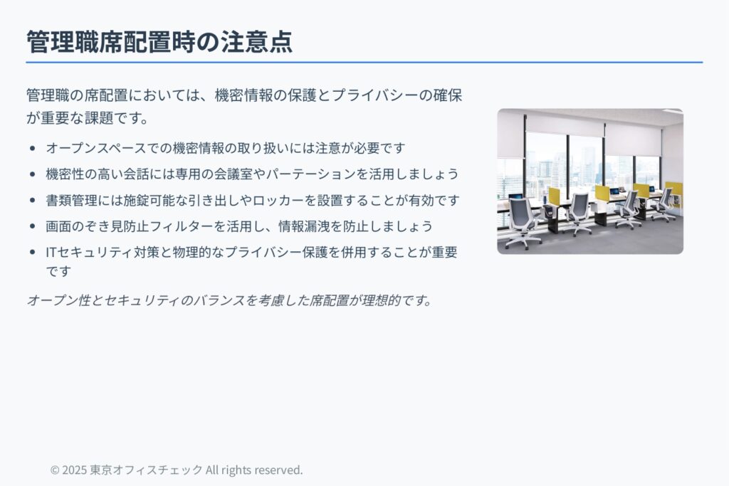 コミュニケーション効率を高めつつ、従業員のプライバシーも守る席配置が求められます。