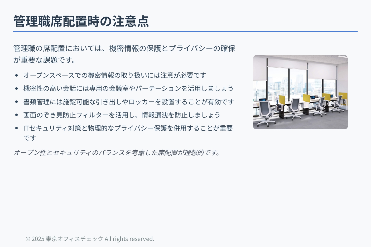 騒音を防ぐための設計が、精神的な快適さを提供します。 - 管理職の席配置: