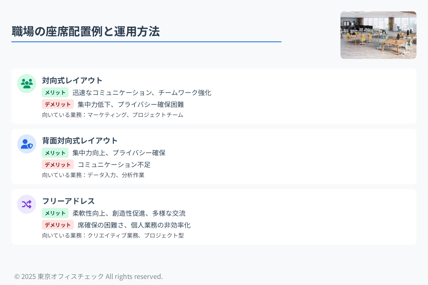 職場の座席配置は様々な形式と運用方法があります。以下では、その具体的な例を紹介します。