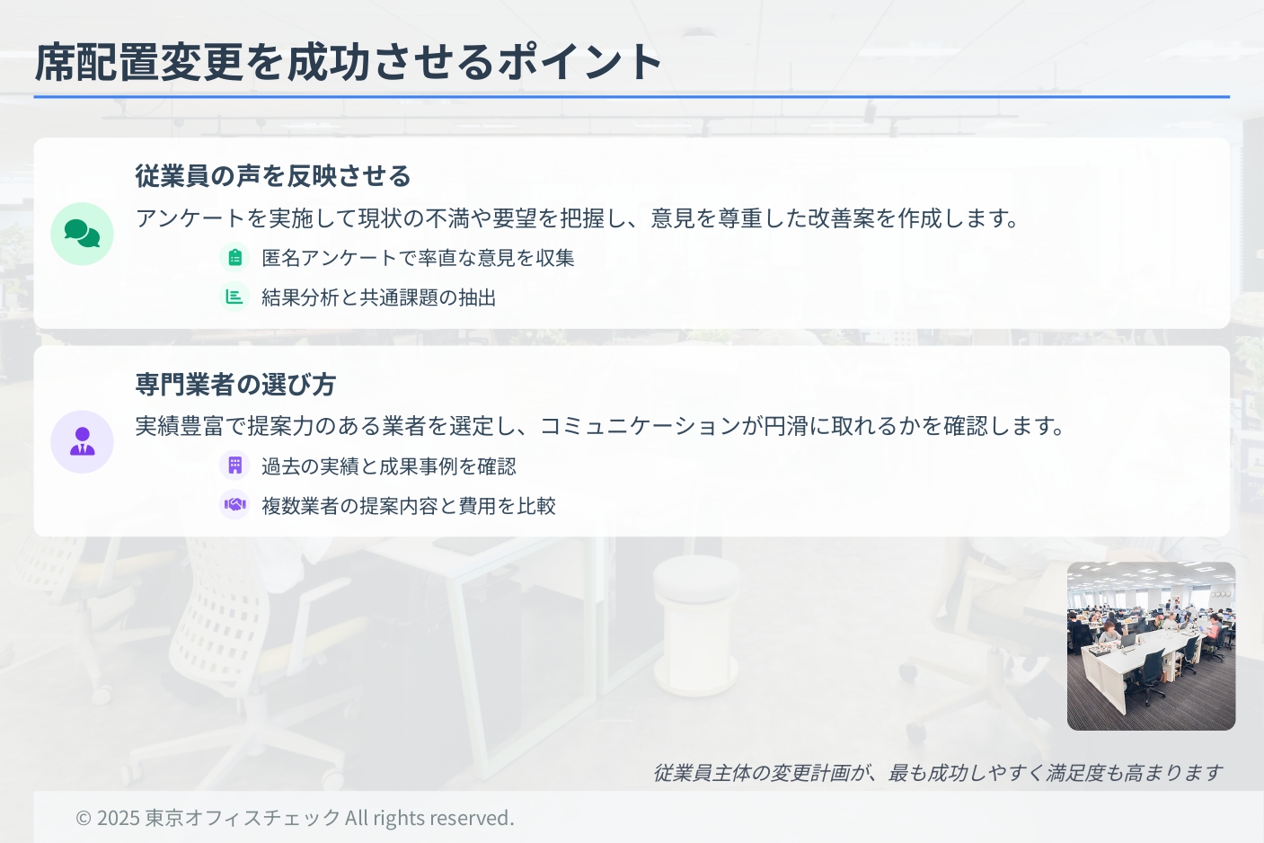 職場の席配置変更を成功させるポイントは、従業員のニーズを正確に把握し実現することです。