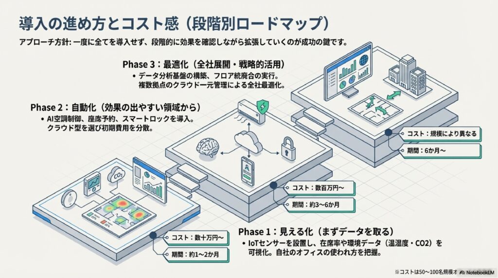 スマートオフィスはすべてを一度に導入する必要はありません。段階的に導入し、効果を確認しながら拡張していくのが現実的なアプローチです。ここでは3つのフェーズに分けた導入ロードマップとコスト感の目安を紹介します。