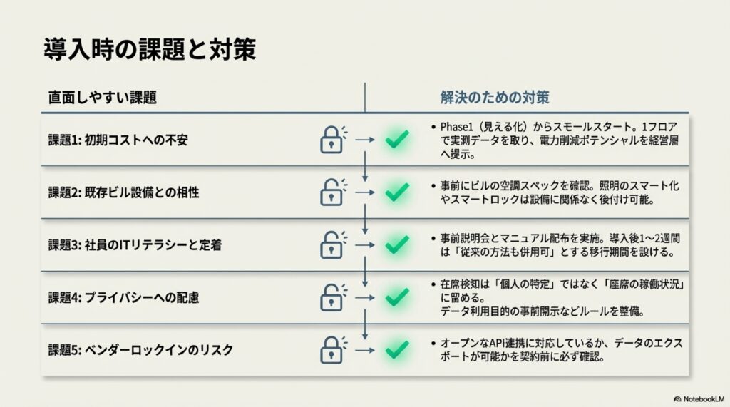 スマートオフィスの導入にはメリットが多い一方で、いくつかの課題も存在します。事前に把握して対策を講じておくことで、スムーズな導入が可能になります。