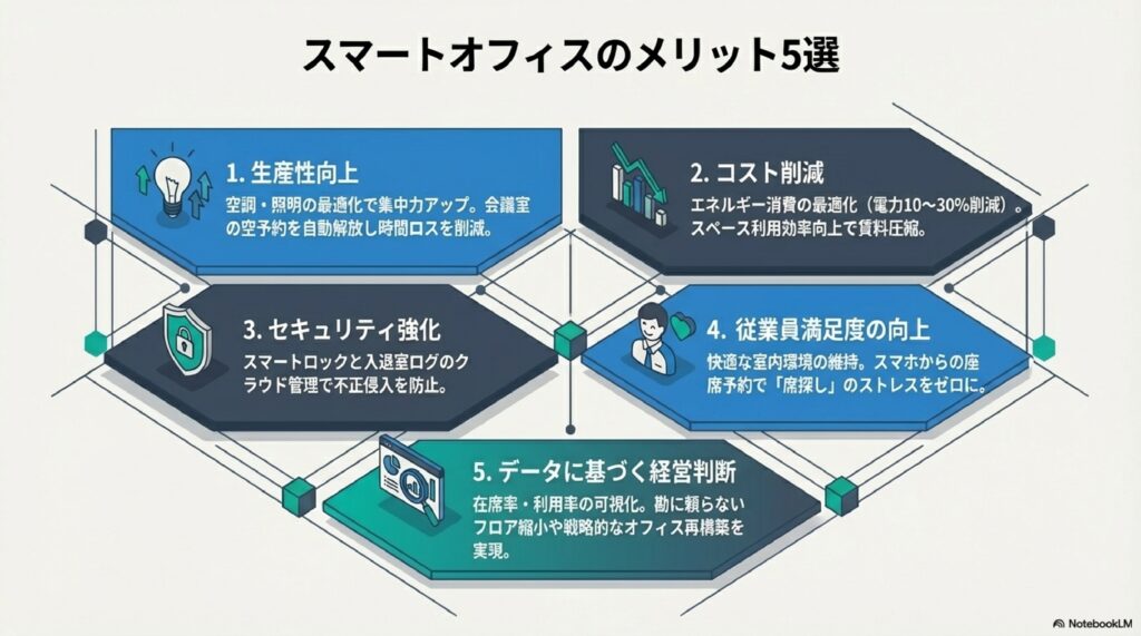 | 1. 生産性向上 | 空調・照明の最適化で集中力アップ、会議室の空予約解消で時間ロス削減 |