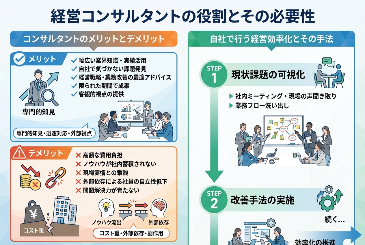 また、外部依存が強くなると、社員の自立性や問題解決力が育たないという副作用も考えられます。こうしたメリット・デメリットを冷静に分析したうえで、自社にとってのコンサルタントの必要性を見極めることが大切です。