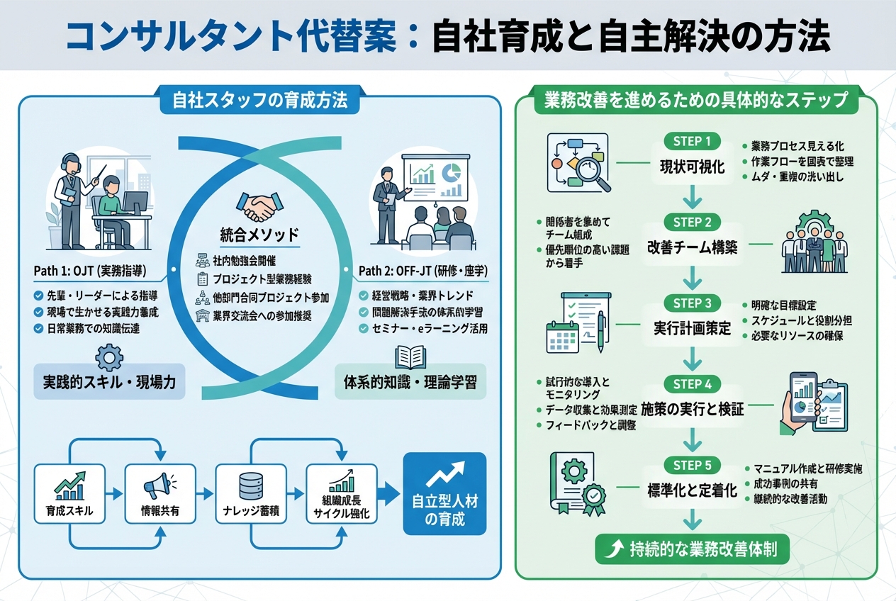 コンサルタントに頼らず、自社スタッフの育成や自主解決能力を伸ばす方法が有効な代替案となります。組織全体で継続的な学びと改善を意識することが成功への鍵です。