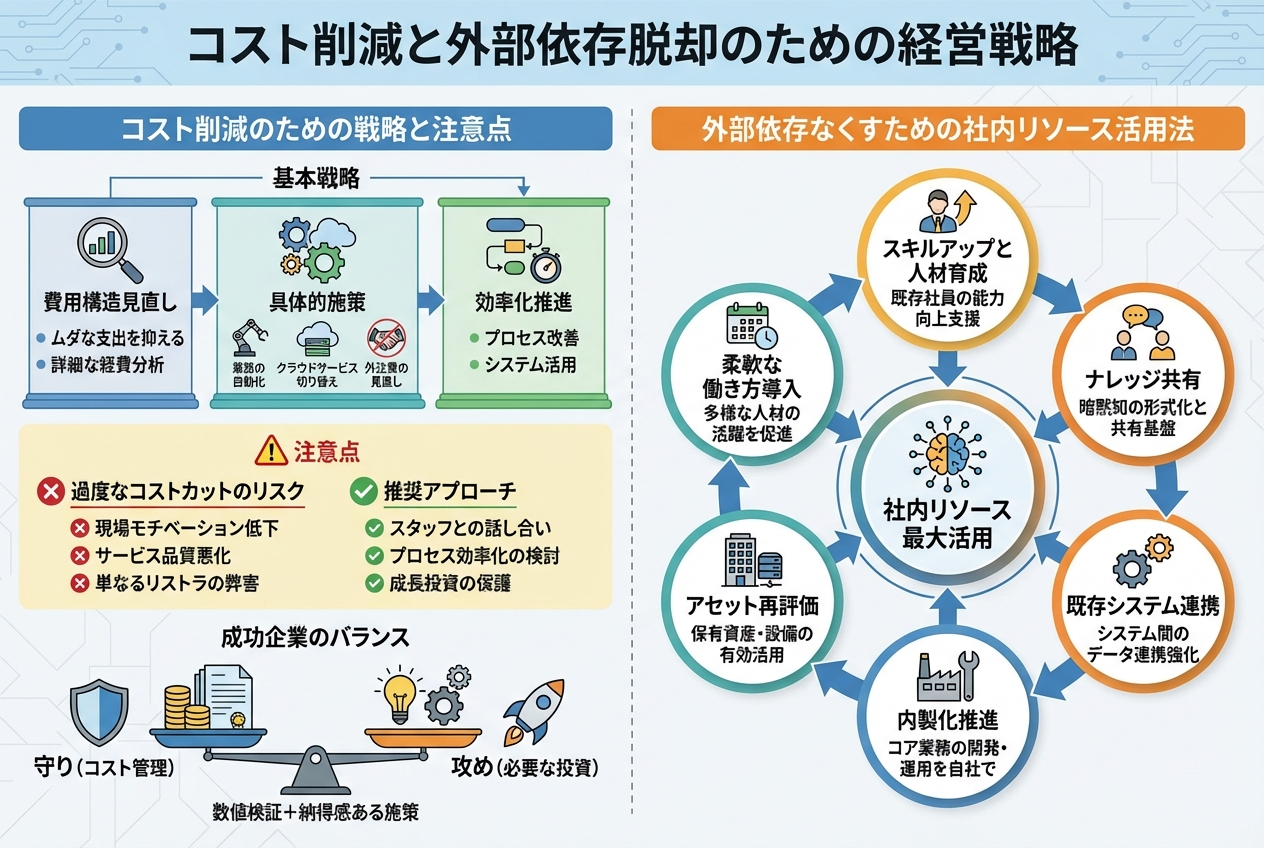 コスト削減と外部依存を減らすには、社内体制の強化やプロセス効率化、リソースの見直しが必要です。地道な改革の積み重ねが、持続的な成長の礎となります。
