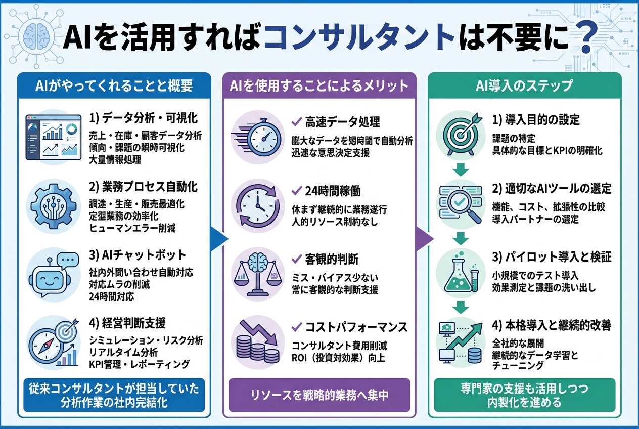 AIの活用は、経営コンサルタントの役割を一部補完したり、データ分析や業務改善支援を自動化できる新しい選択肢となりつつあります。今後の経営のあり方に大きな変化をもたらします。