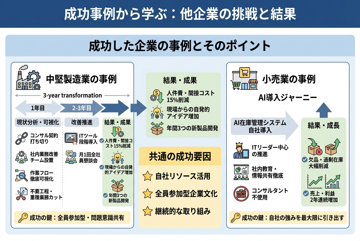 他にも小売業の事例では、AIによる在庫管理システムを自社導入し、欠品や過剰在庫を大幅に削減。コンサルタントを使わずとも、ITリーダーを中心に社内教育や情報共有に取り組んだ結果、売上・利益が二年連続で増加したという成果も出ています。共通点は「自社の強みを最大限に引き出し、全員参加型の企業文化を築いた」点です。