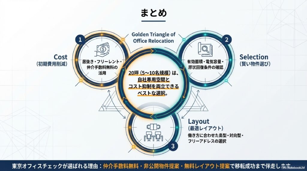 本記事では、20坪オフィスの広さや収容人数の基本から、エリア別の賃料相場、物件選びのチェックポイント、初期費用の削減方法、移転スケジュール、そして島型・対向型・フリーアドレス型の3つのレイアウトパターン比較まで、総務・施設担当者や経営者が知っておくべき情報を網羅的に解説します。