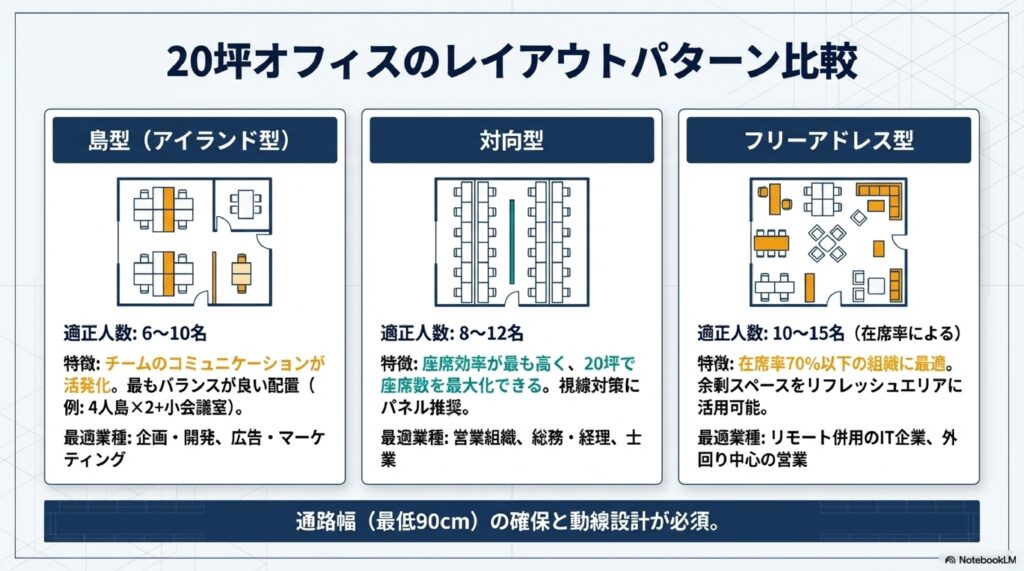 20坪(約66㎡)の限られたスペースを最大限に活用するには、業務スタイルに合ったレイアウト選びが欠かせません。ここでは代表的な3つのパターン――島型・対向型・フリーアドレス型を比較します。