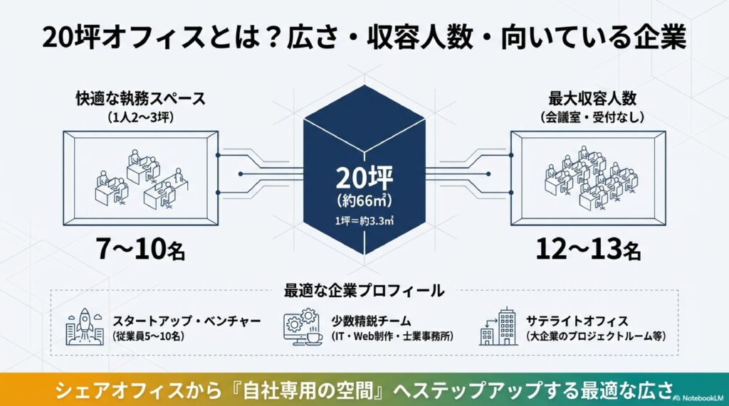 20坪は約66㎡(1坪=約3.3㎡)に相当します。一般的にオフィスでは1人あたり2〜3坪が快適な執務スペースの目安とされており、20坪であれば7〜10名がゆとりを持って働ける広さです。会議室や受付スペースを設けない場合は最大12〜13名程度まで収容可能ですが、快適性を維持するには10名前後を目安にするとよいでしょう。坪と平米の換算については、坪と平米の違いに関する解説記事も参考にしてください。