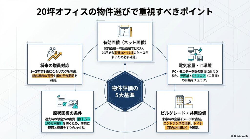 20坪は限られたスペースだからこそ、物件の条件が日々の業務効率に直結します。以下の5つの観点を必ずチェックしましょう。