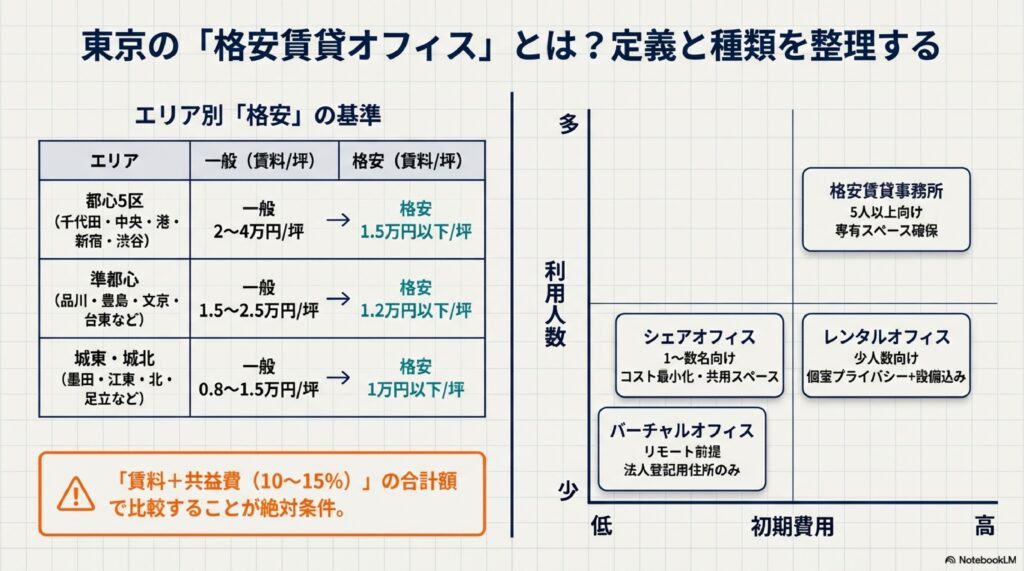 - 「格安」の基準は坪単価で判断し、共益費込みの月額総コストで比較する