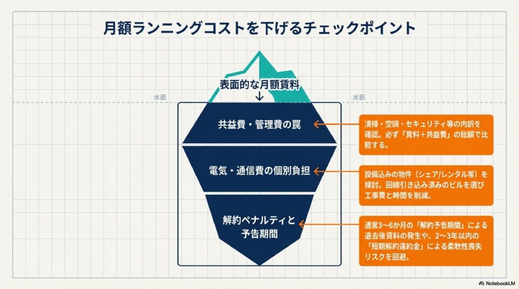 賃貸オフィスでは、解約の際に「解約予告期間」(通常3〜6か月前)の告知が必要です。解約予告が遅れると、退去後も賃料を払い続けなければならないケースがあります。また、短期解約違約金(2〜3年以内に退去した場合のペナルティ)が設定されている物件もあるため、契約書の解約条件は必ず事前に確認してください。スタートアップや成長フェーズの企業は事業規模が急変しやすいため、解約条件の柔軟性は特に重要な確認ポイントです。「解約予告6か月・短期解約違約金あり」という条件の格安物件は、表面的な賃料の安さとは裏腹に、事業状況の変化への対応が難しくなるリスクをはらんでいます。