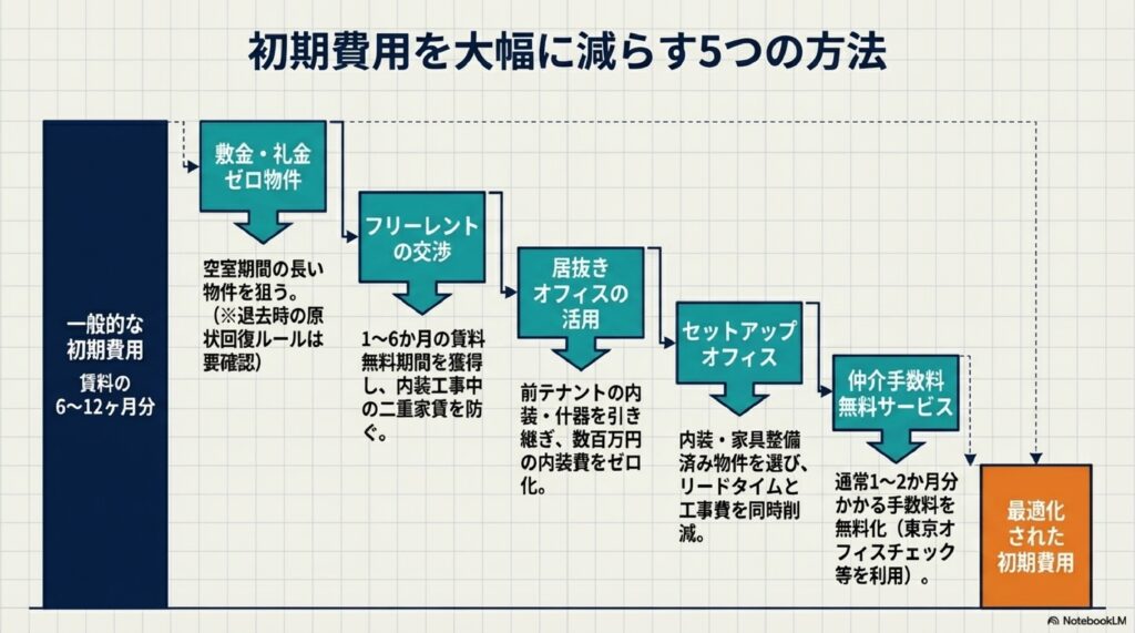 月額賃料だけでなく、初期費用(敷金・礼金・仲介手数料・内装工事費など)は賃料の6〜12か月分に及ぶことがあります。以下の5つの方法を組み合わせることで、初期費用を大幅に削減できます。