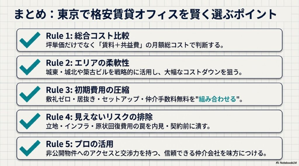 東京で格安の賃貸オフィスを探す際には、「月額賃料の安さ」だけでなく、初期費用・ランニングコスト・立地・設備の総合的なコストで判断することが重要です。本記事のポイントを振り返ります。