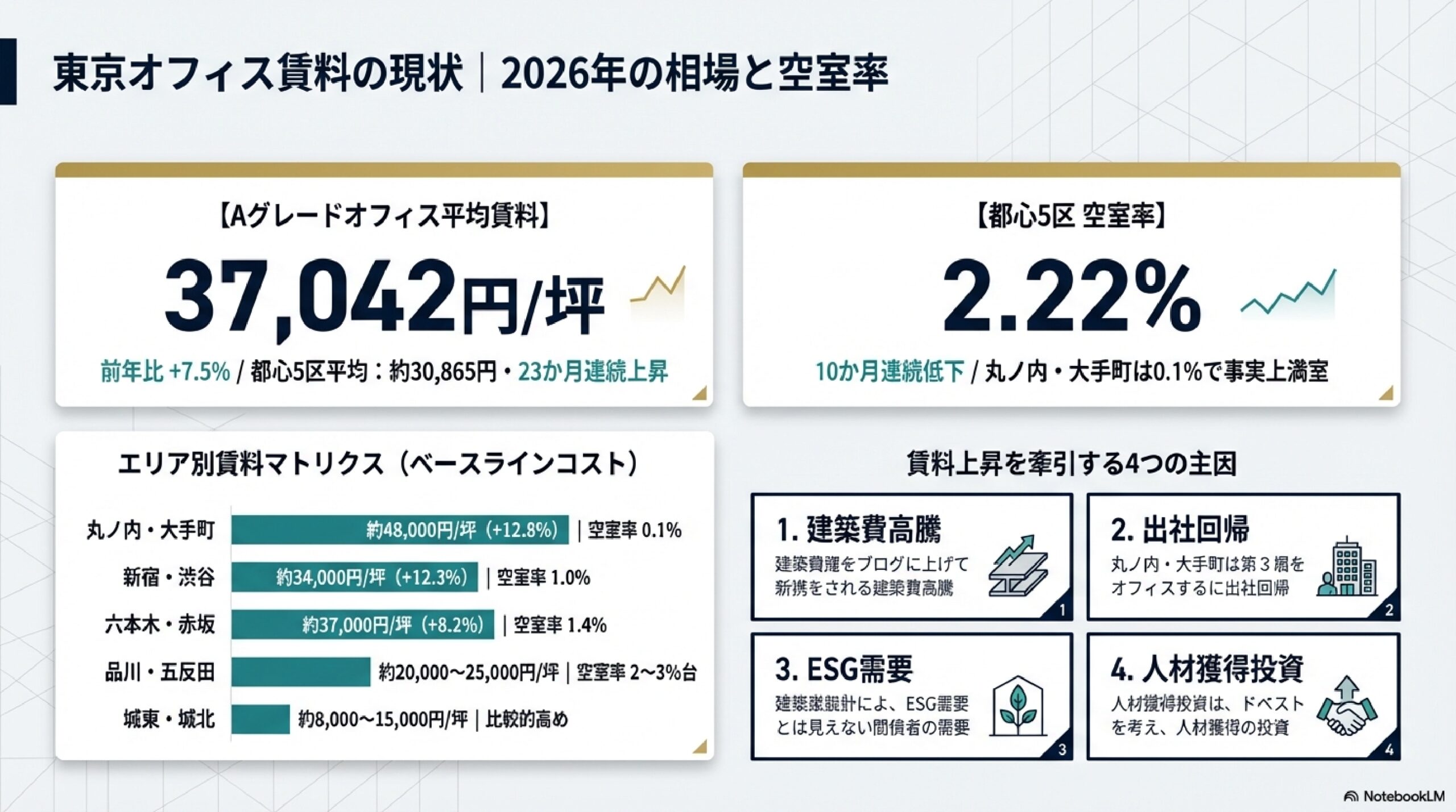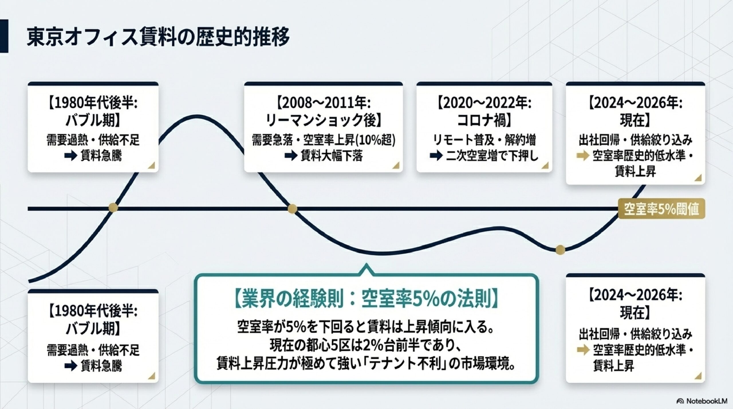 | 2024〜2026年(現在) | 出社回帰・供給絞り込み | 賃料上昇・空室率が歴史的低水準へ |