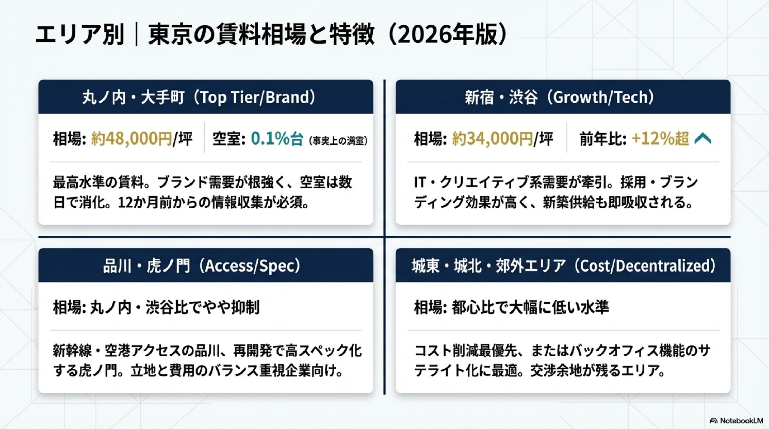 オフィス選びでは、エリアごとの賃料水準と市場特性を理解した上で、自社のニーズに合った判断をすることが重要です。
