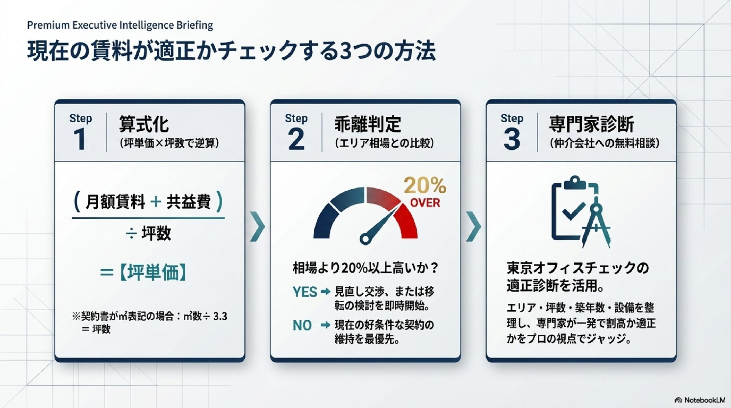 本記事で紹介したエリア別の参考坪単価と自社の坪単価を比較してみてください。自社の坪単価が相場より20%以上高い場合は、賃料見直し交渉または移転の検討に値します。逆に相場より低い場合は、現在の契約条件を維持することが優先事項です。