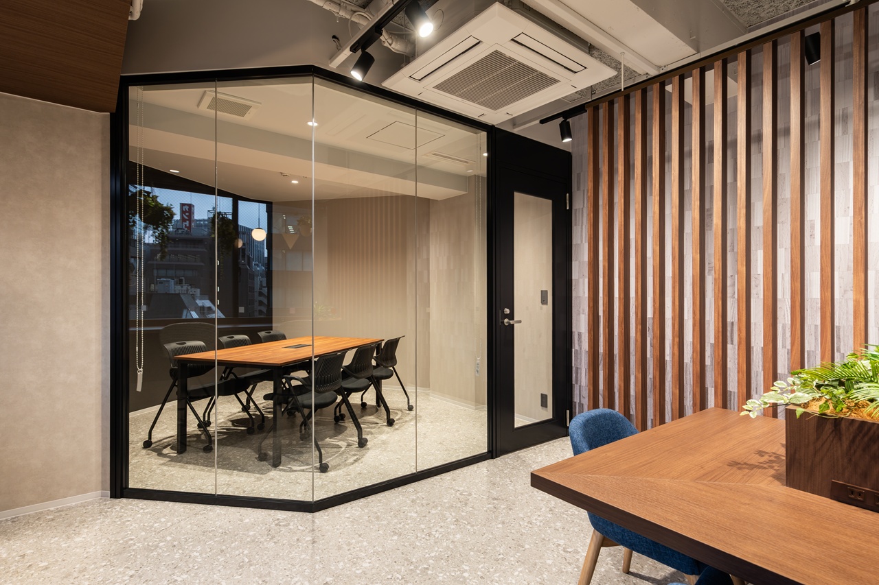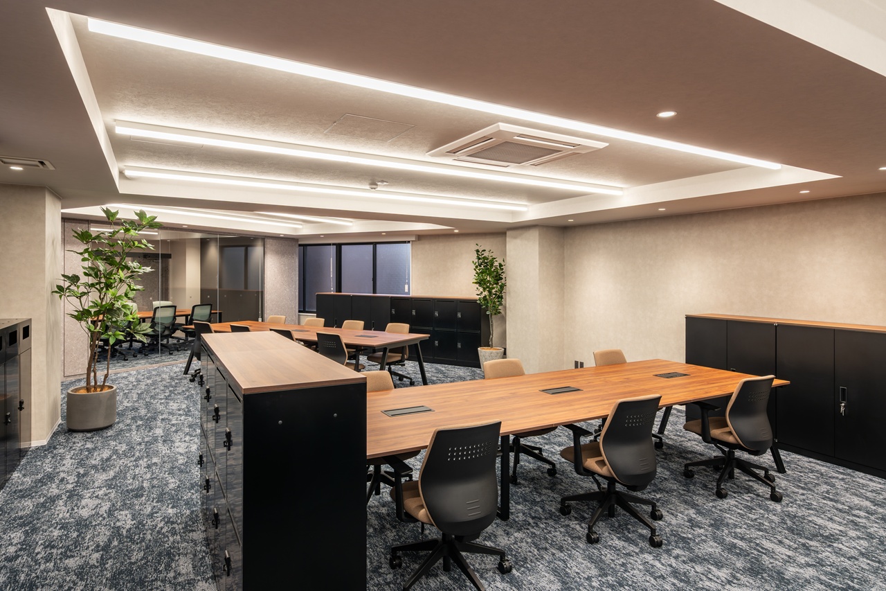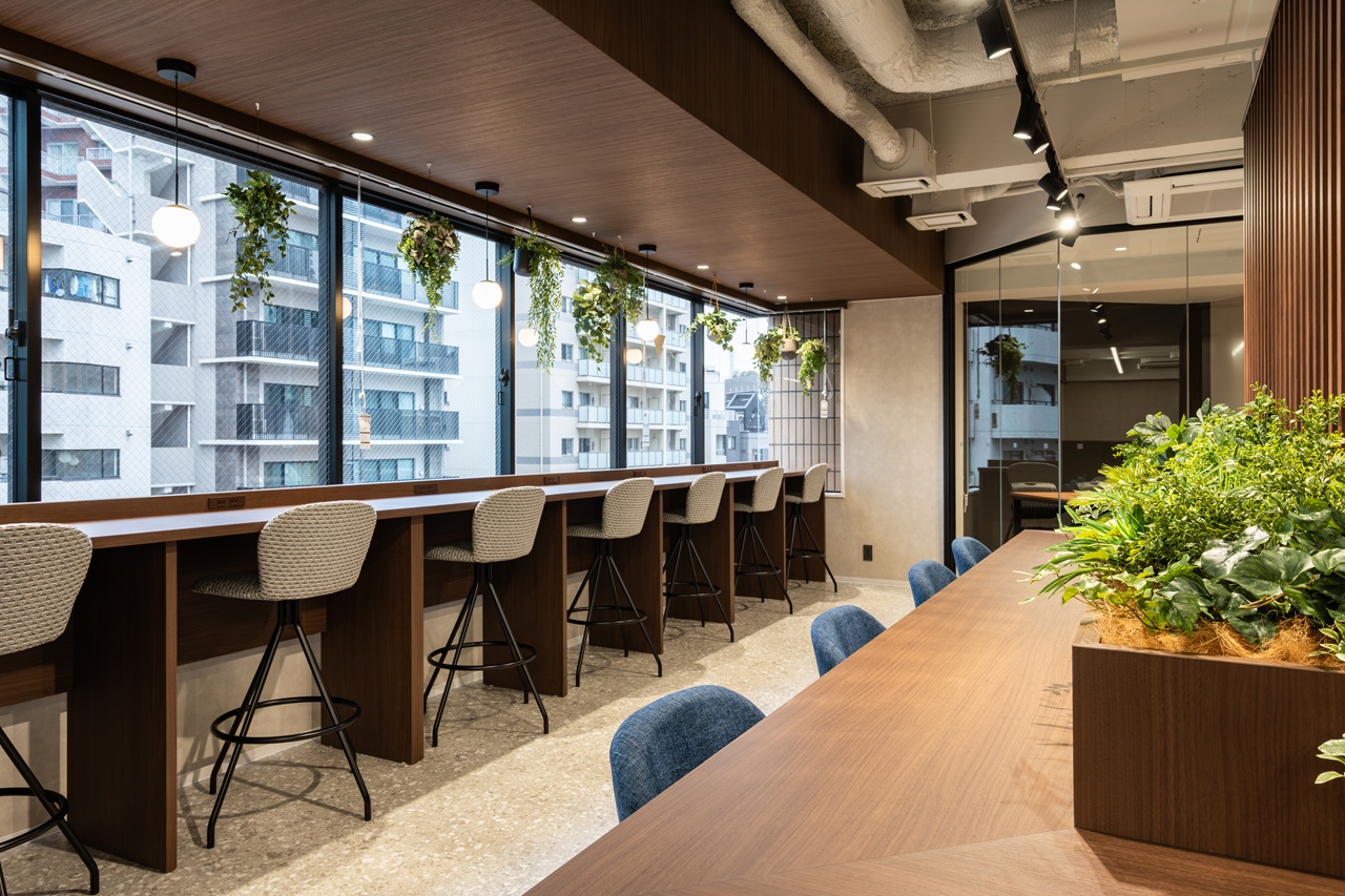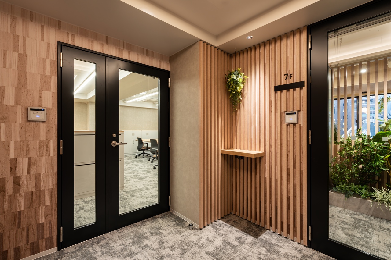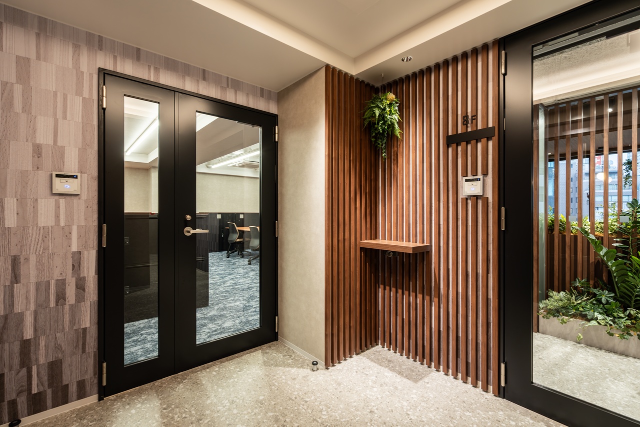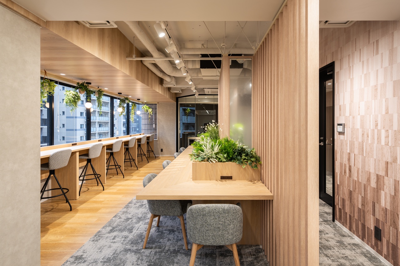 今回募集となる7階・8階の最大の特徴は、内装工事が不要な「フルセットアップオフィス」である点です。あらかじめ受付や会議室が造作されているだけでなく、執務室用のデスクなどの什器類もすべてセット済みとなっております。 室内は「木と緑に包まれた快適空間」をコンセプトにしたバイオフィリックデザインが採用されており、ホッと落ち着く環境が業務効率と社員の皆様のエンゲージメントを強力に後押しします。