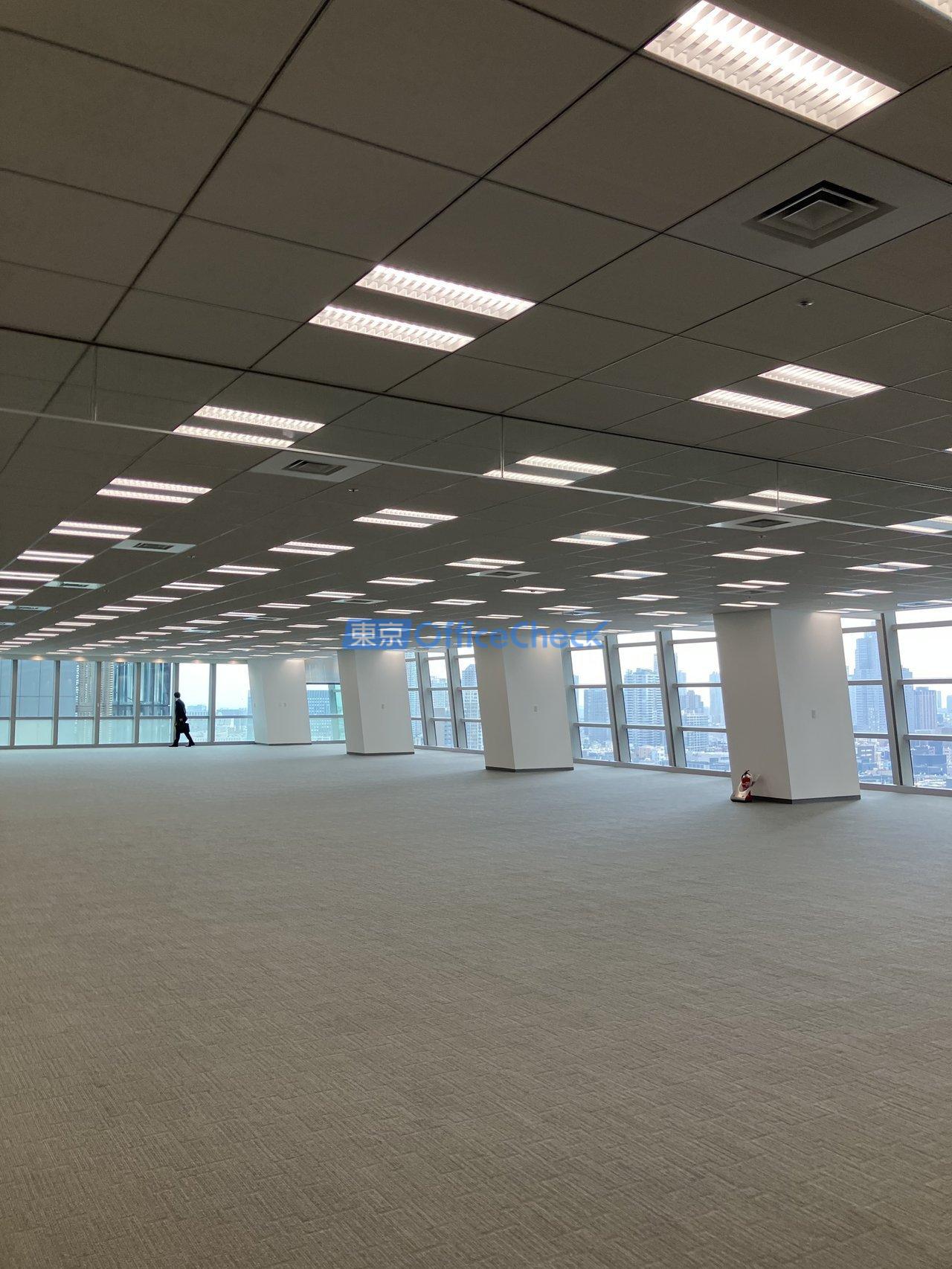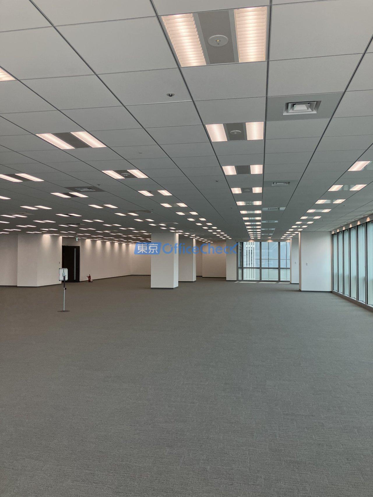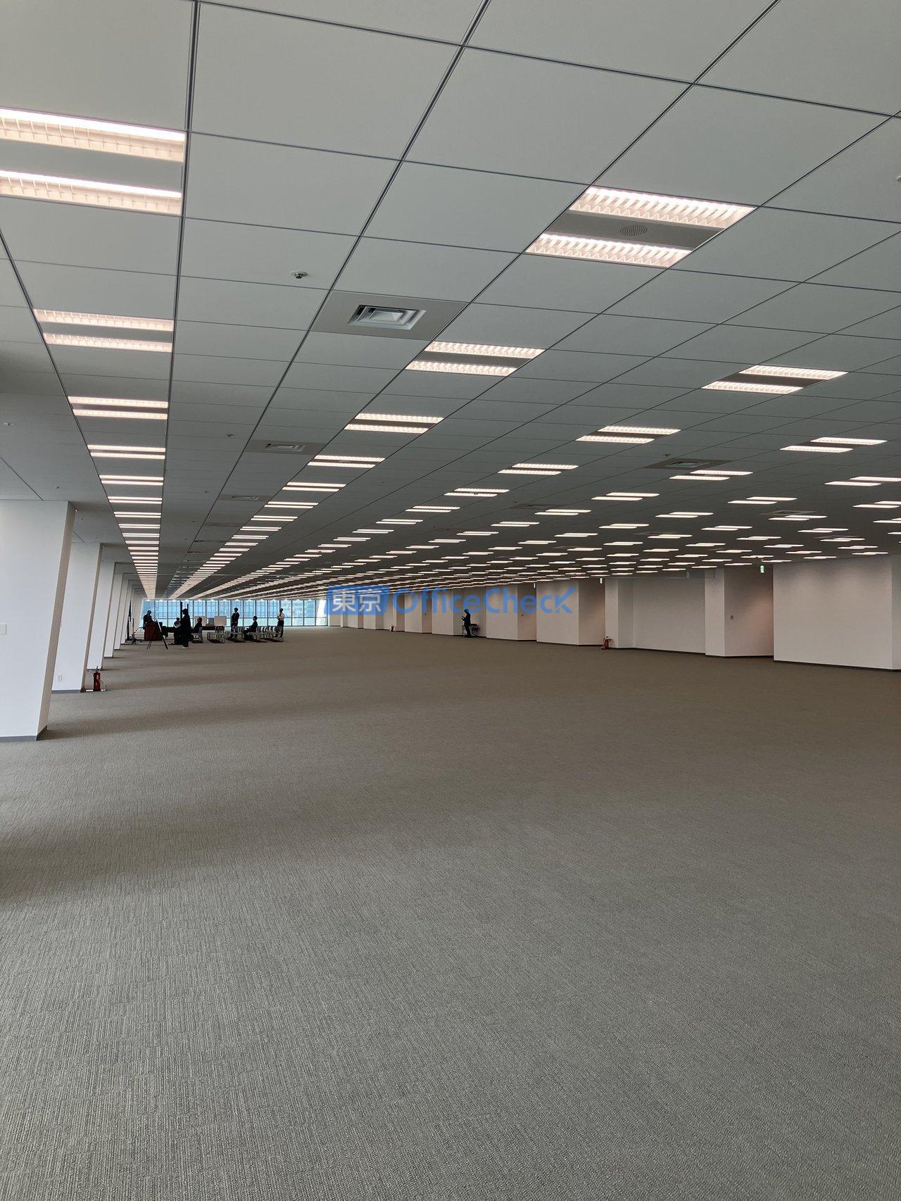 床荷重は500kg/㎡と高い水準を確保しており、サーバールームの設置や大量の書類・機材を扱う業種にも対応できます。空調はフロアを33区分した可変風量方式(VAV)の個別空調を採用しており、エリアごとに細かく温度調整が可能なため、大フロアでも快適な室内環境を維持できます。グリッド型システム天井の採用により、照明・空調の配置変更もレイアウトに合わせて効率的に行える設計です。