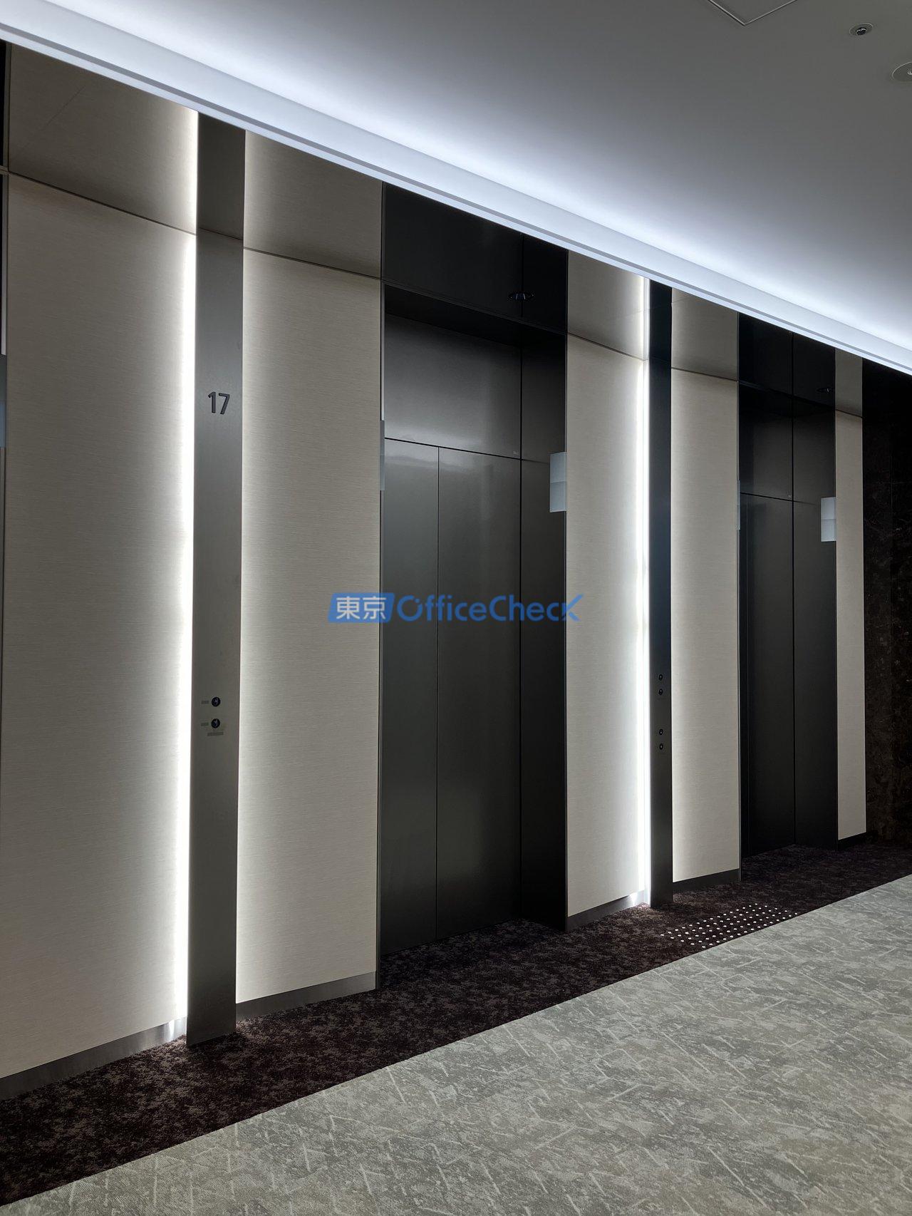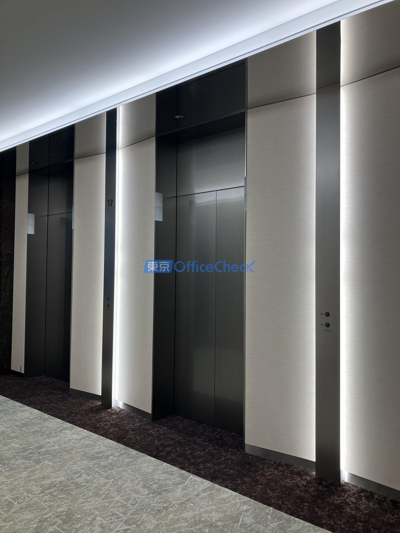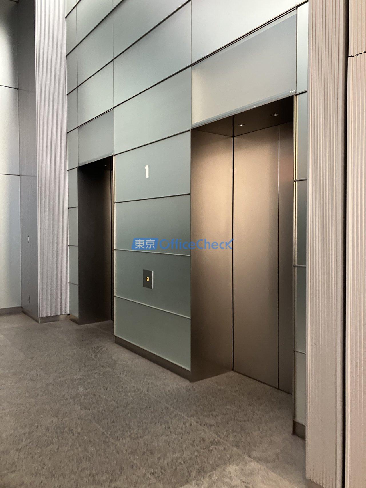 エレベーターは24人乗り乗用20基に加え、非常用兼人荷用2基の計22基を備えており、基準階900坪規模のテナントが集まるビルにふさわしい輸送力を確保しています。朝夕のラッシュ時でも待ち時間を最小限に抑え、大人数の移動にもストレスなく対応できます。