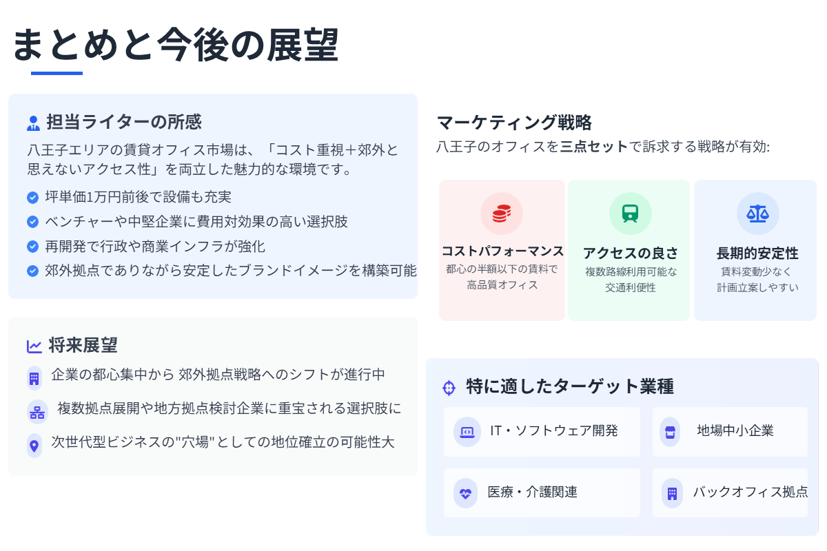マーケティング視点では、八王子のオフィスを「コストパフォーマンス」「アクセスの良さ」「長期的安定性」の三点セットで訴求する戦略が有効です。特にバックオフィス・IT支店・医療・介護系など、立地とコストを両立したい業種にとって、八王子は次世代型ビジネスの“穴場”として際立っています。今後も企業は都心集中から郊外拠点の戦略へと広げていく中、同エリアは複数拠点展開や地方拠点検討を進める際の重宝される選択肢となるでしょう。