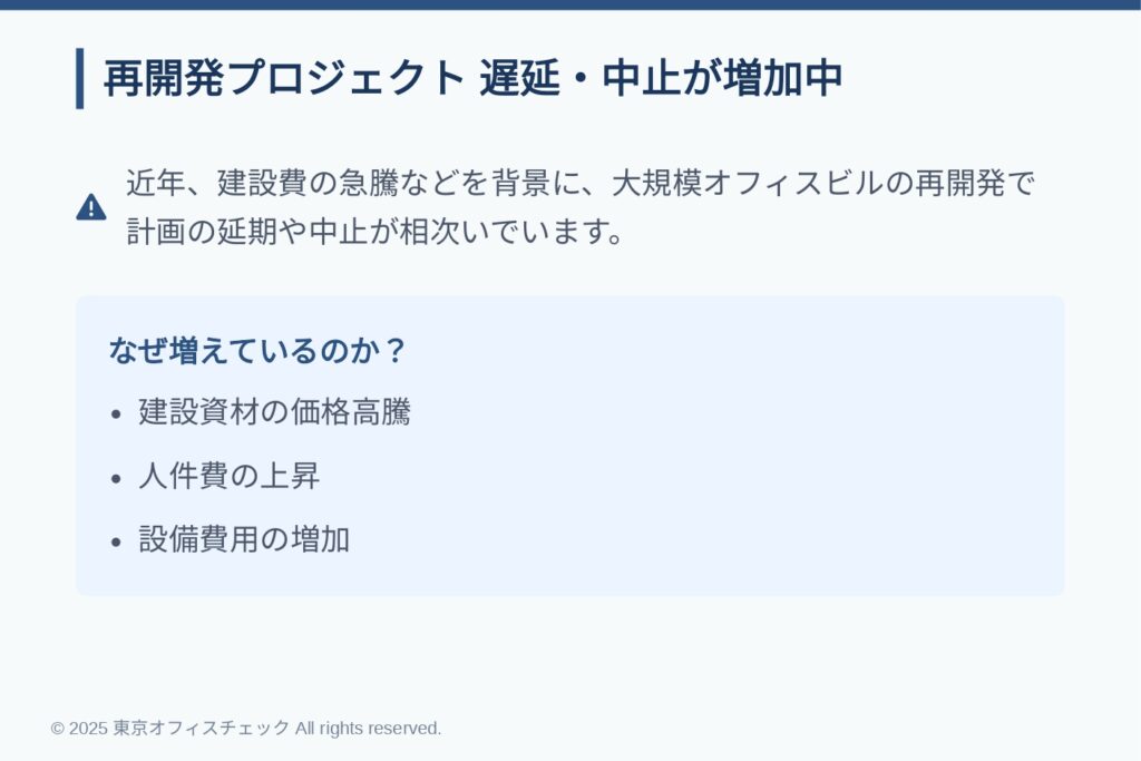 オフィス移転を検討するバックオフィス担当者にとって、再開発プロジェクトの動向は大きな関心事です。最近では東京都中野区の中野サンプラザ再開発の中止、渋谷スクランブルスクエアの工期延期など、大規模プロジェクトの遅延や見直しが相次いでいます。その背景には、建設費の急騰があります。