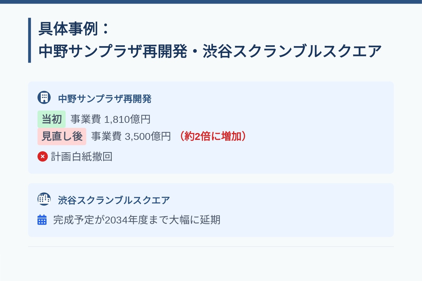 中野サンプラザの再開発では、当初1810億円だった事業費が約2倍の3500億円に膨らむ見込みとなり、計画が白紙撤回されました。渋谷スクランブルスクエアも2034年度まで完成が遅れる予定です。全国的にも再開発144地区のうち8割弱で遅延や費用の増加が生じており、平均して期間は2.7年延び、費用も2割増加しています。