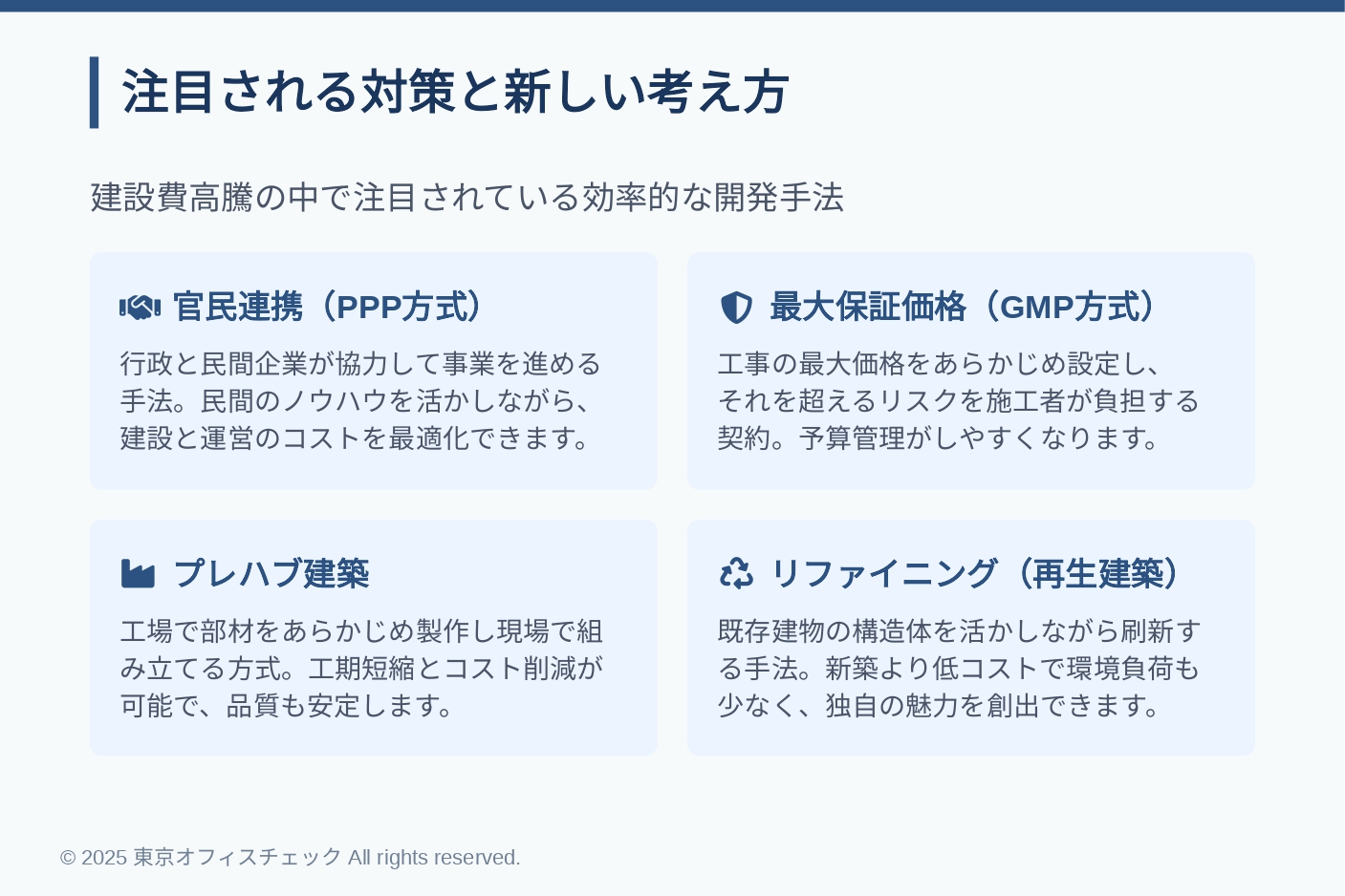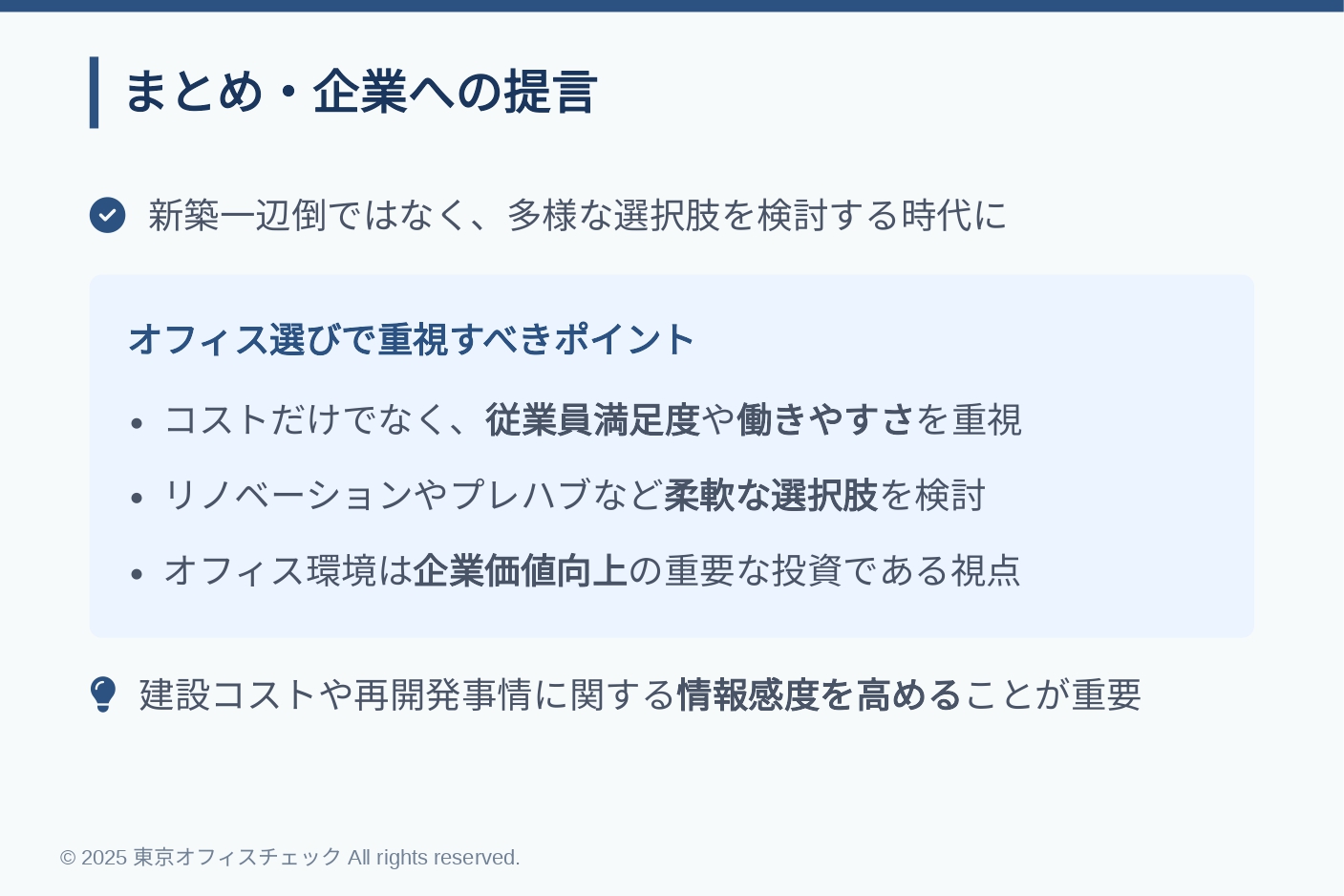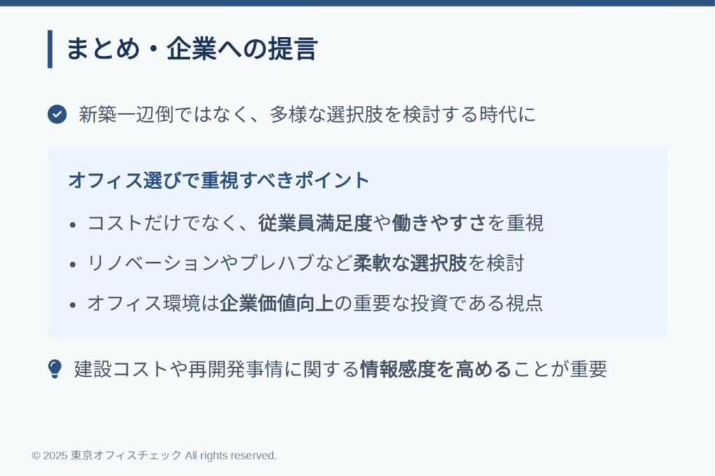 建設費の高騰は、企業の成長戦略に直結するオフィス移転の意思決定にも影響を与えます。マーケティング視点で見ると、従業員満足やブランド価値を高めるための“場所”の選定は、単なるコスト論だけでなく、企業価値向上の重要な投資です。今後は高額な新築物件だけでなく、リノベーション済みビルやプレハブを含む多様な選択肢を柔軟に検討する必要があります。最適な移転先を見極めるためにも、建設コストや再開発事情に関する情報感度を高めておくことが不可欠です。