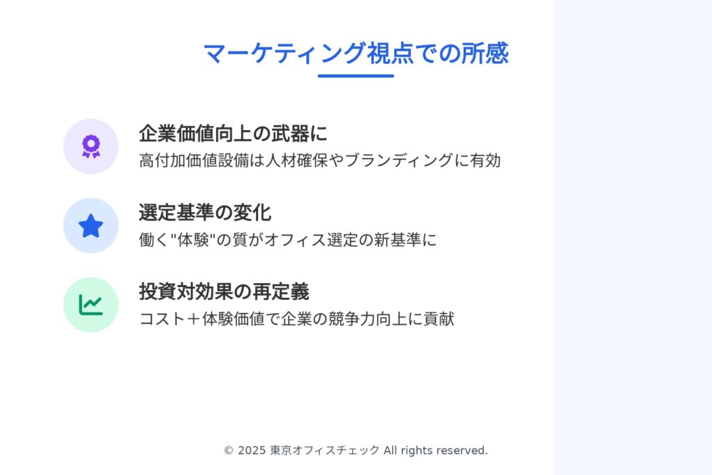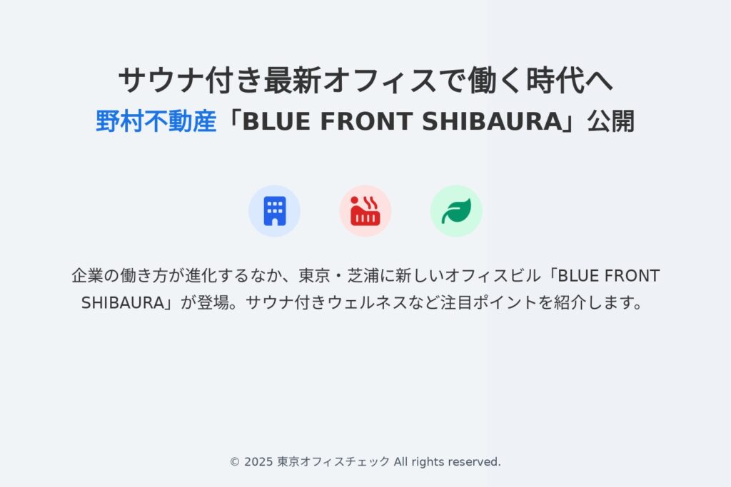 「BLUE FRONT SHIBAURA」のような高付加価値オフィスは、企業ブランディングと人材確保の強力な武器になり得ます。特に、サウナやジム、絶景テラスといった“ウェルビーイング”を重視した設計は、従来の「働く場所」から「働きたくなる場所」への進化を象徴しています。バックオフィス部門としては、コスト面の最適化に加え、こうした付加価値によって得られる従業員満足度や離職率低下の効果も評価軸に入れるべきタイミングです。今後のオフィス選定では、立地や賃料だけでなく「体験価値」そのものが大きな差別化要因になるでしょう。
