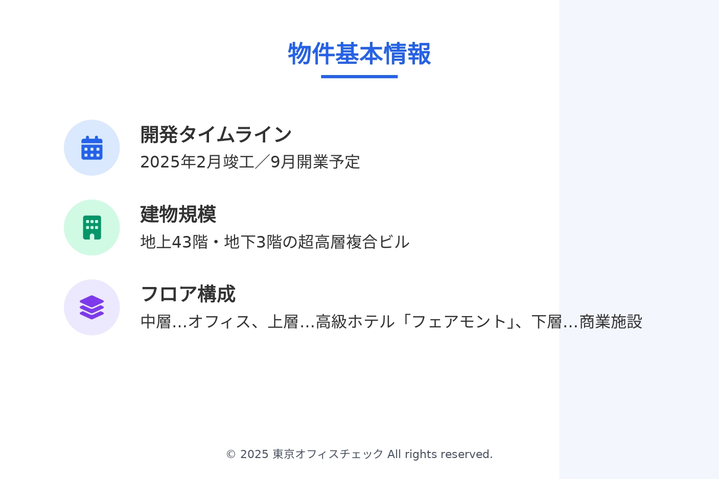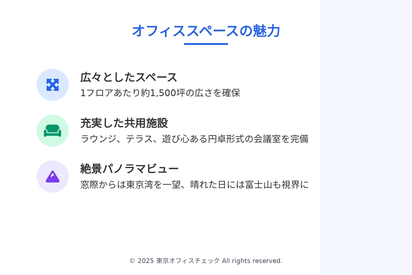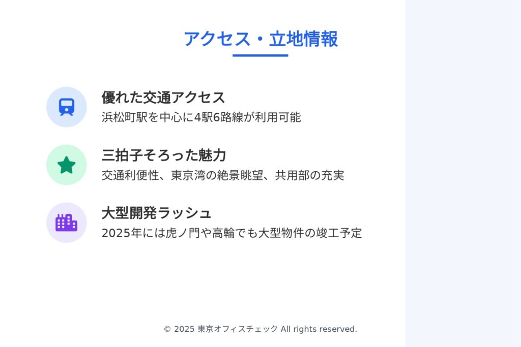 アクセス面でも、浜松町駅を中心に4駅6路線が利用可能。交通利便性、眺望、共用部の充実という三拍子が揃い、働く場所としての魅力は十分です。2025年には他にも虎ノ門や高輪などで大型物件の竣工が予定されており、企業にとってはまさに“選ぶ時代”が到来しているといえるでしょう。