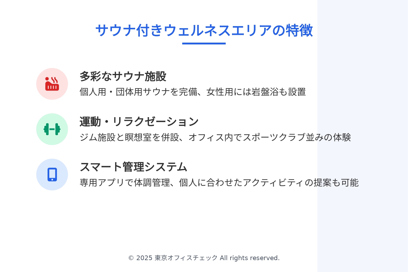 特に目を引くのは、サウナ付きのウェルネスエリアです。サウナは個人・団体用の両方を完備し、女性用には岩盤浴も設置。ジムや瞑想室も併設されており、まるでスポーツクラブがビルに内包されているような環境が用意されています。これらは専用アプリで管理され、体調に応じたアクティビティの提案なども可能になる予定です。