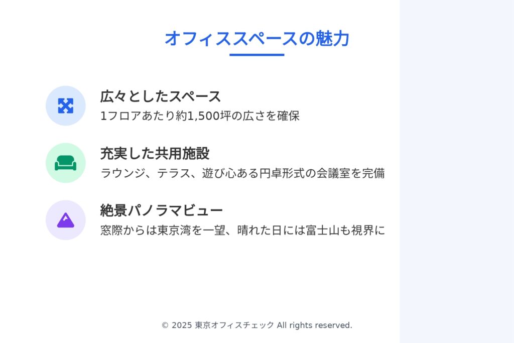 オフィススペースも魅力的です。1フロアあたり約1,500坪の広さがあり、ラウンジやテラス、会議室エリアが充実しています。窓際からは東京湾を一望でき、天候が良ければ富士山も視界に入るなど、日々の業務に癒しを与える工夫が満載です。会議室は円卓形式を採用するなど遊び心のある設計で、CMやドラマ撮影にも使われることを想定しています。
