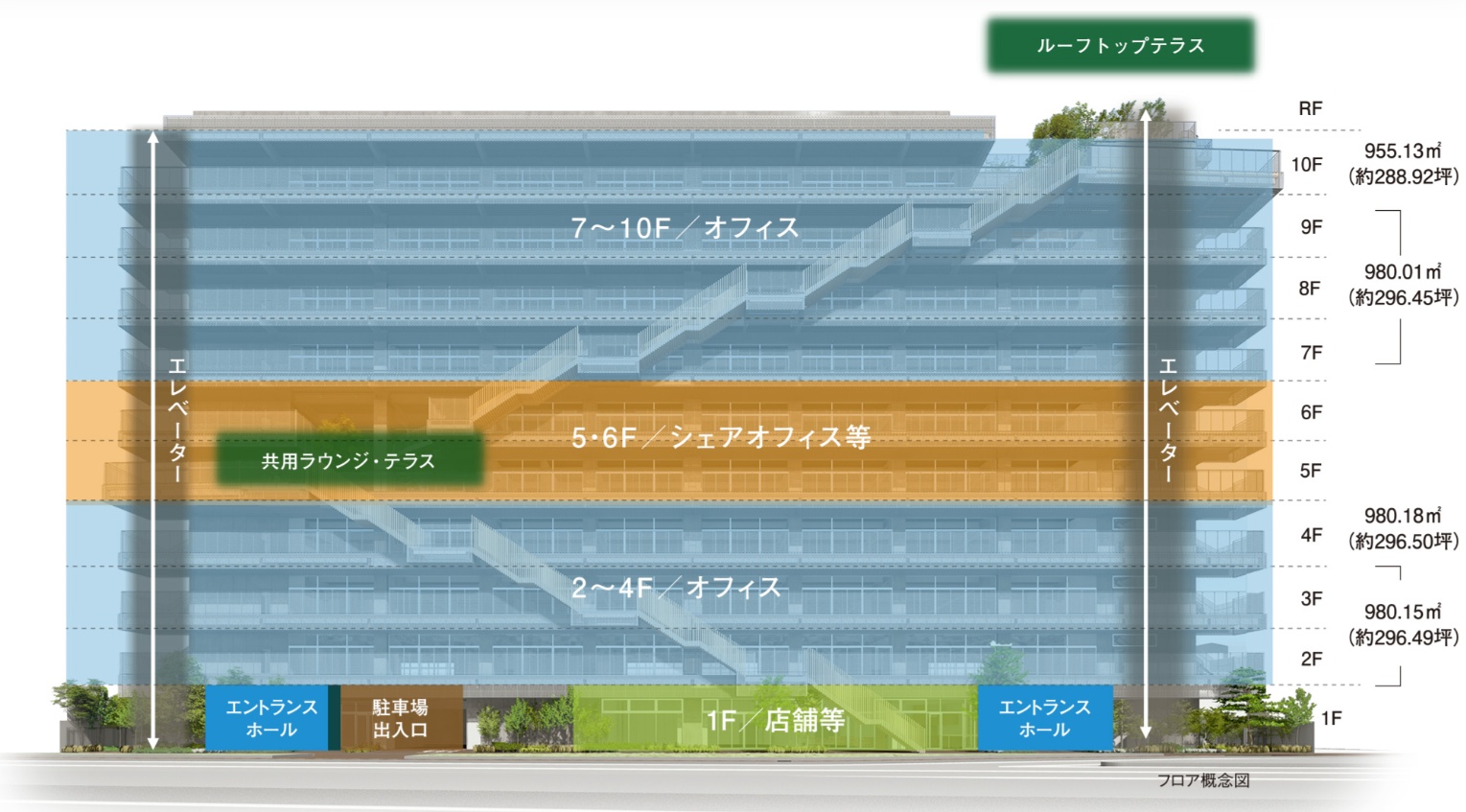 - 内部構造: 1フロア1テナントの区画が多く、独立性が高いのが魅力です。エレベーターからダイレクトに専有部へアクセスできるため、受付を自由にレイアウトでき、自社専用フロアとしてのアイデンティティを確立しやすい設計です。